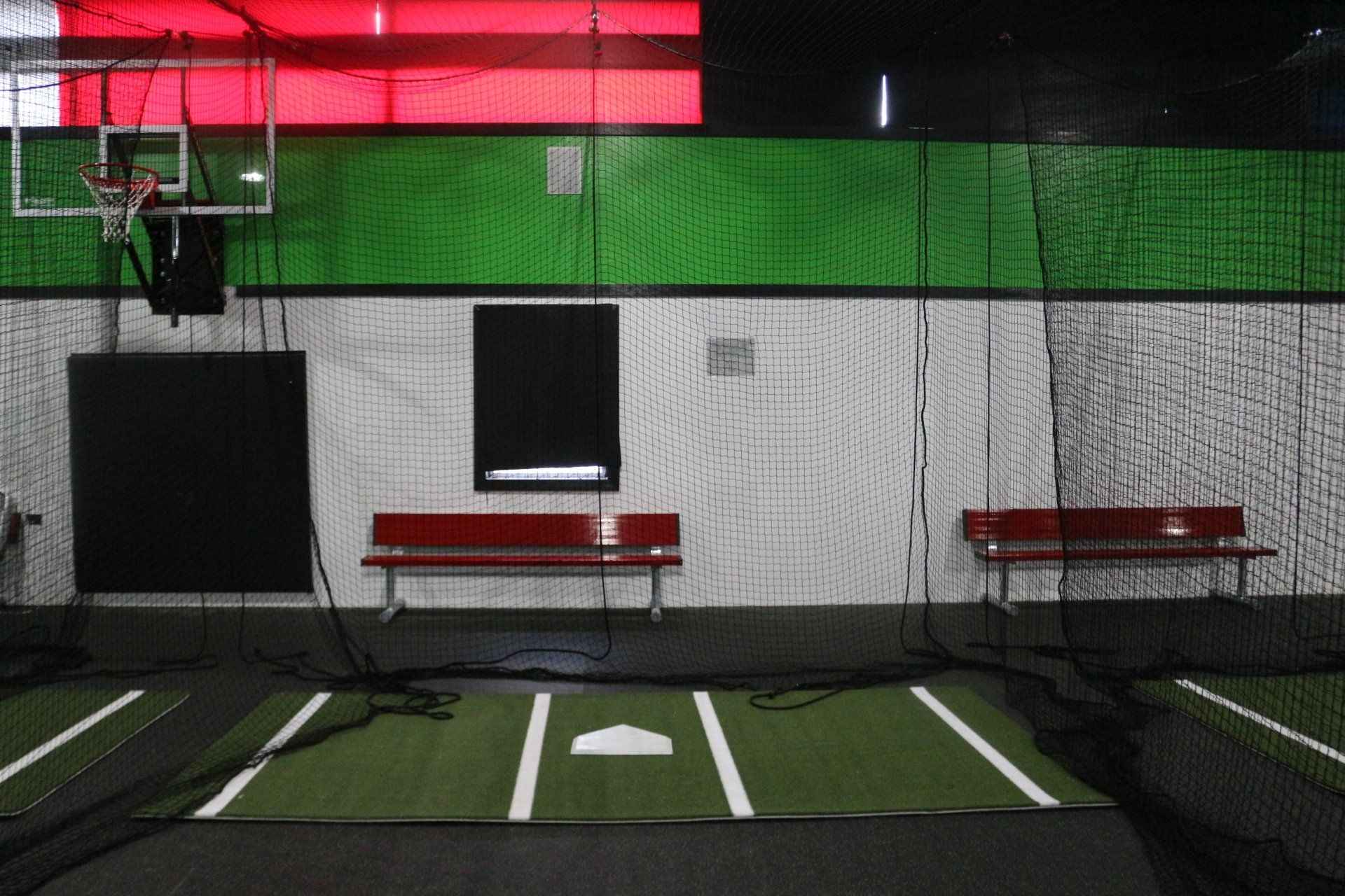 The Indoor Academy covers 8,400 square feet with durable rubber mat flooring and a well-lit court area. Our cages expand to reach a length of 55 feet, and can be separated into two sections for soft tossing and drills. Their versatile design, combined with the benefits of indoor practice, add variety and convenience to any baseball team's practice session. Top-of-the-line pitching mounds, high-quality tees, a small infield area, and a vibrant backdrop all facilitate a wide range of techniques, drills, and multi-position development.